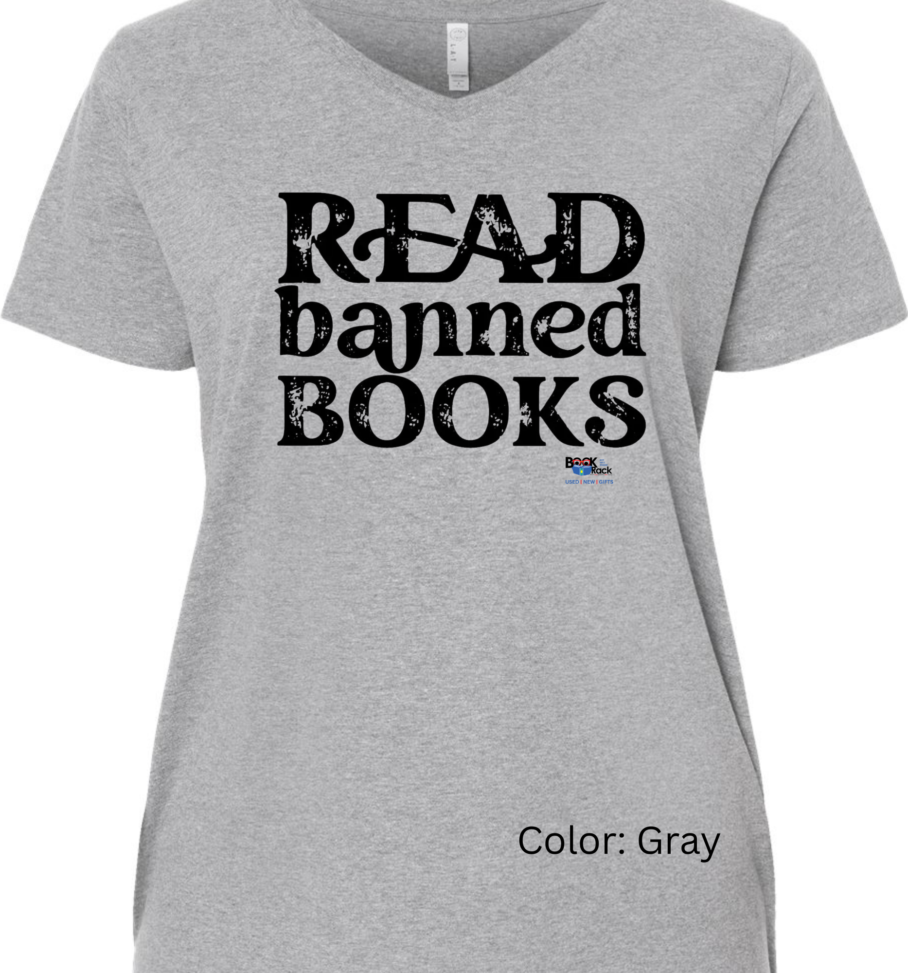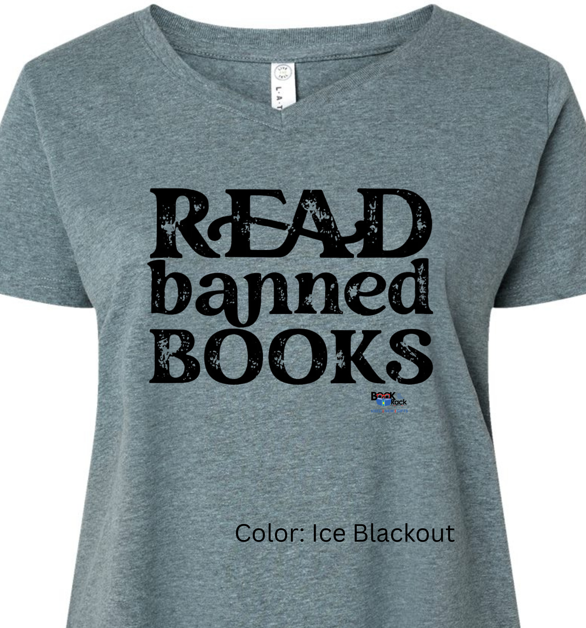 "READ banned books" Curvy Collection V-Neck - Fundraising Shirt for Local Area Children's Summer Reading Program